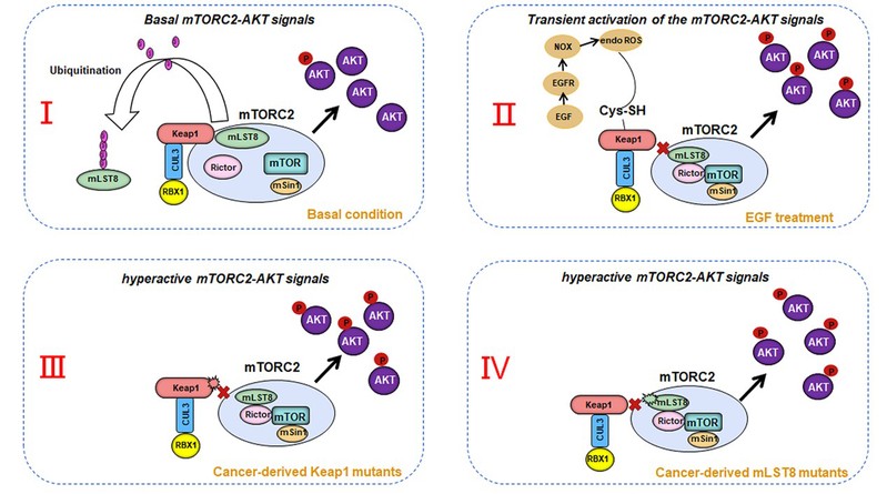 总之,这项工作本研究首次提出了“Keap1-mTORC2-AKT”信号调节轴失调在肿瘤发生发展过程中的重要作用,为mTOR、AKT抑制剂应用于Keap1突变型肿瘤的靶向治疗提供了理论基础。