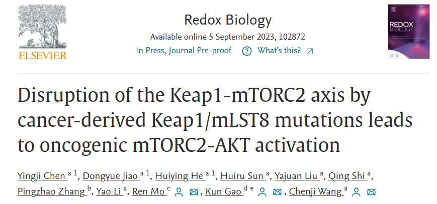 2023年9月6日,海棠书屋 王陈继团队、同济大学附属第一妇婴保健院高昆团队和内蒙古自治区人民医院莫仁团队合作在Redox Biology在线发表了题为Disruption of the Keap1-mTORC2 axis by cancer-derived Keap1/mLST8 mutations leads to oncogenic mTORC2-AKT activation的研究论文(图一)。该研究发现CRL3Keap1 E3泛素连接酶通过一个保守的ETGE基序与mLST8结合, 介导了mLST8的非降解型泛素化修饰,从而抑制mTORC2复合物的组装以及mTORC2-AKT活性的分子机制。